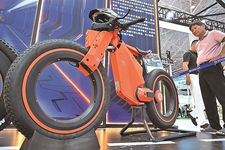 图②:在消博会现场拍摄的一款国产无辐式氢能摩托车。新华社发