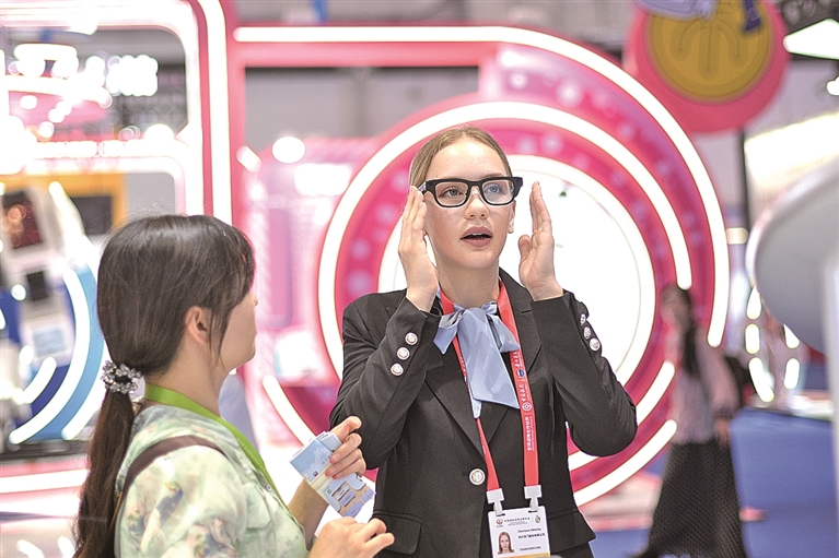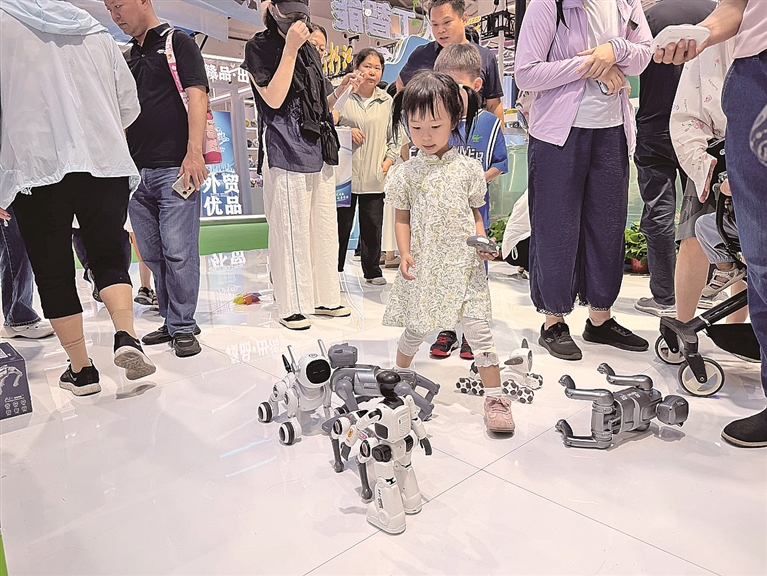 图③:在消博会6号馆广西展台,小朋友试玩智能机器人玩具。光明网记者 杨亚楠摄/光明图片